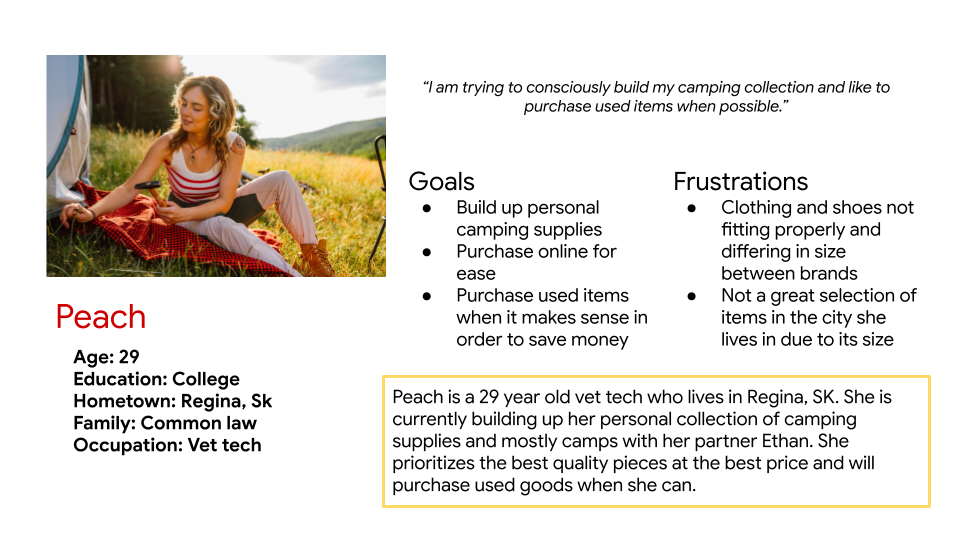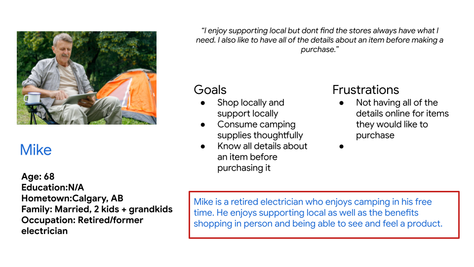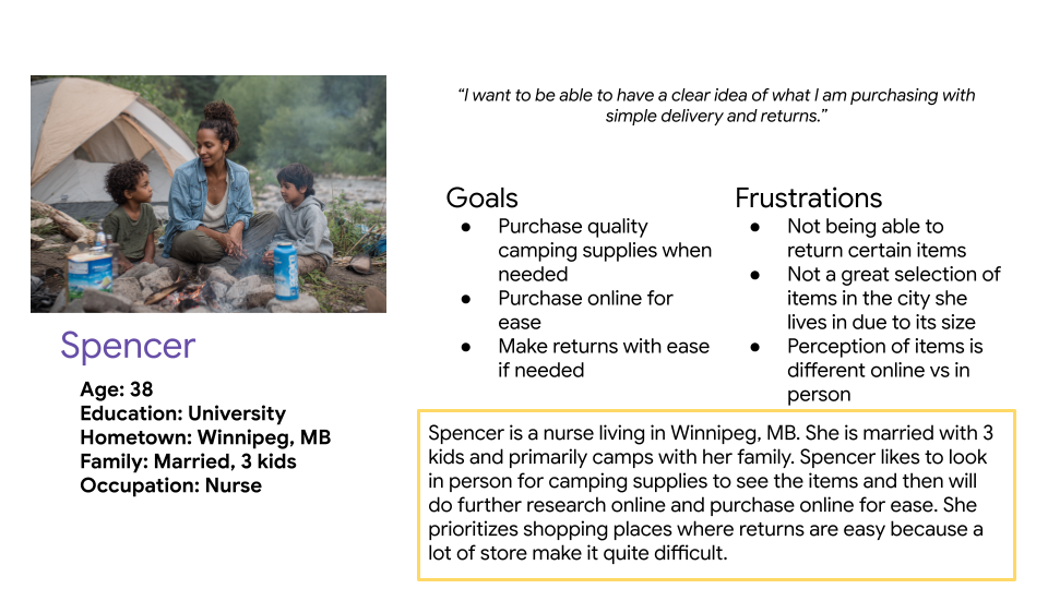 I engaged with a diverse group of people to understand how they shop for their camping gear, how often they shop and their experience online versus in store.